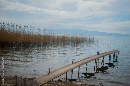 © Josif, Naklejka premium Small improvised pier in a lake with a lot of grown Phragmites in the lake