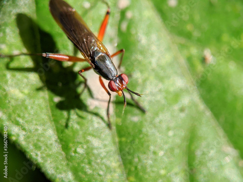 Naklejka premium small insect on a green leaf, with a blurry background