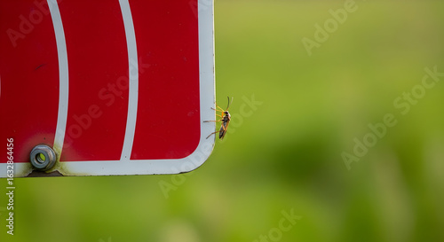 © Rido, Obraz premium Small Insect Resting On A Bright Red And White Sign In Green Meadow