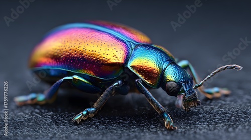 Fototapeta premium Small iridescent beetle displays vibrant rainbow colors on textured surface.