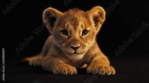© Goncharenko, Obraz premium Small Lion Cub on Black Surface