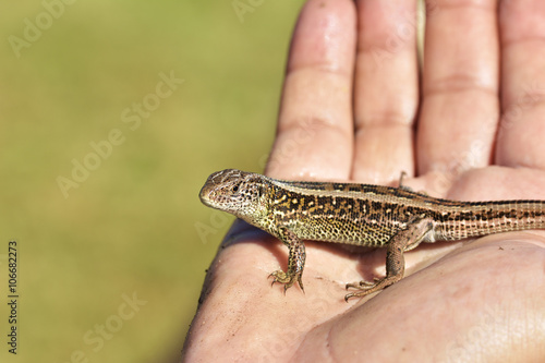 Fototapeta premium Small lizard sits on hand
