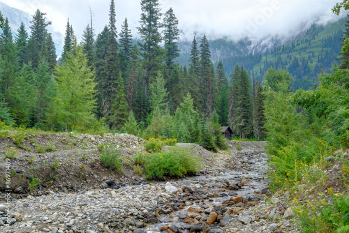 © bettys4240, Fototapeta premium Small log cabin set back in the mountains in Glacier.
