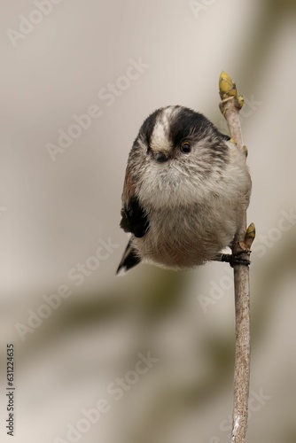 Naklejka premium Small Long Tailed Tit perched atop a thin stick, gazing out into the horizon