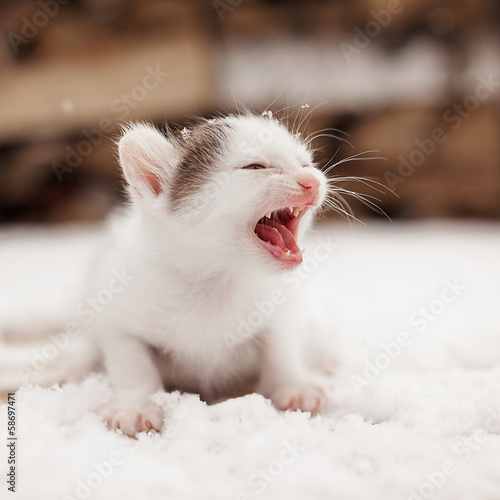 Fototapeta premium Small mewing lonely kitten on snow