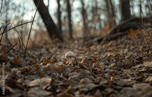 © Niken, Obraz premium Small Mushroom Growing on Leafy Forest Floor During Autumn Season