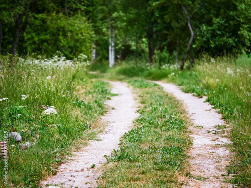 Fototapeta premium Small narrow country side road with green grass and car track area. Nobody. Selective focus. Rural area. Calm nature vibe due to natural green color.