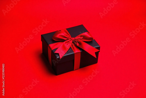 Fototapeta premium small neatly wrapped gift box on vibrant red background with shiny red ribbon