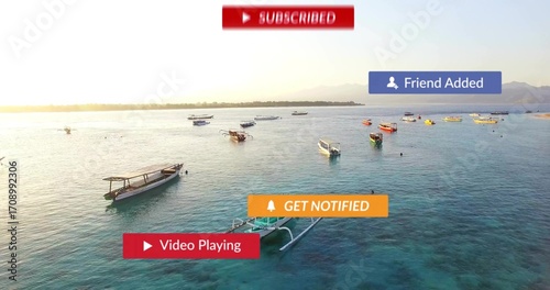 © vectorfusionart, Obraz premium Small outrigger boats gently drifting on turquoise sea at sunrise, with UI overlays