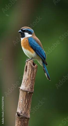 Fototapeta premium Small passerine avian creature with vibrant blue and orange plumage perched upon a broken wooden stalk