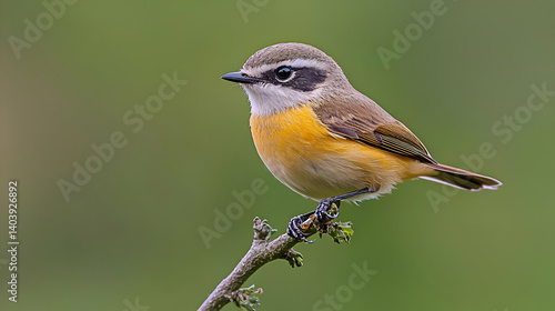 © Sujito, Fototapeta premium Small Perching Bird with Brown Yellow and Grey Feathers on Green Branch