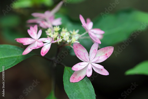 Obraz premium Small pink "Ajisai (Hydrangea) Dance party" flowers that have begun to bloom.