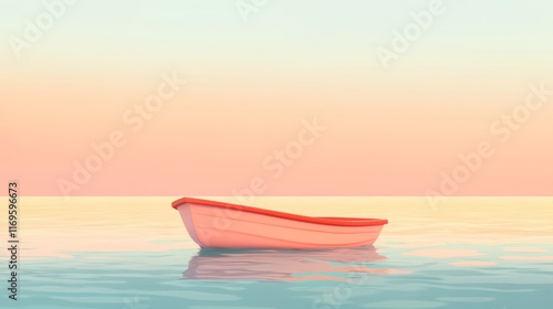 © Khaligo, Naklejka premium Small pink boat floating on calm water during sunset