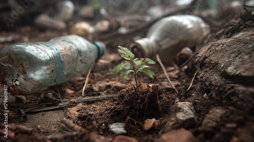 Obraz premium Small plant growing amidst trash