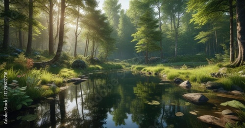 Obraz premium small pond in a forest with greeny surroundings, trees, forest