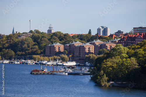 © Mykola Iegorov, Naklejka premium Small private boats along canal in Stockholm. View from the bridge