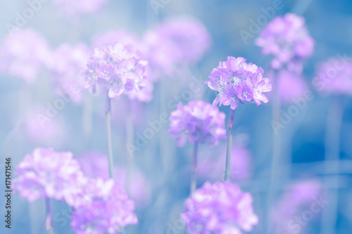 © Yulia, Obraz premium Small purple flowers on the turquoise background in the sunlight. Selective soft focus.