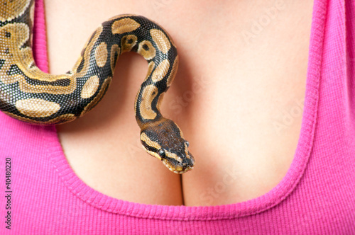 © Solid photos, Naklejka premium Small python crawling over young woman breasts