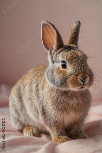 © Nemanja, Fototapeta premium Small rabbit sitting calmly on a pink surface, fur transitioning from light to dark brown
