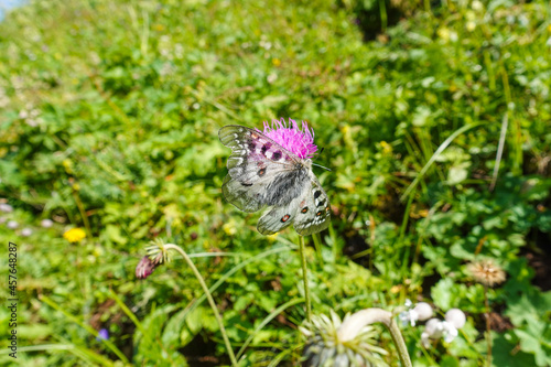 © thomaseder, Fototapeta premium small rare mountain apollo butterfly on a pink blossom in the nature