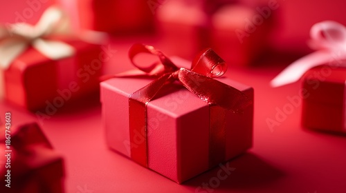 © fotofabrika, Fototapeta premium Small red gift boxes with ribbons on a red surface during a festive celebration