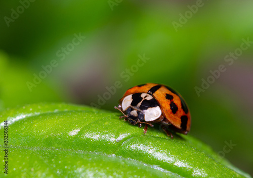 Fototapeta premium Small red ladybird resting on a green basil leaf