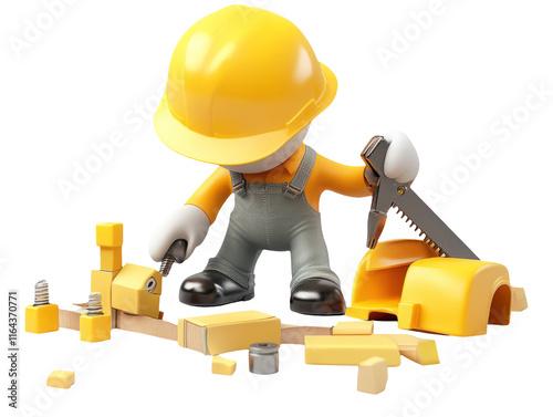 © Maina, Obraz premium Small Repairman Working with Clamp and Glue in Creative Setting