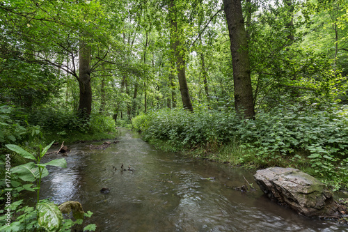 Fototapeta premium Small river at a lush and verdant forest at the Divoka Sarka. It's a nature...