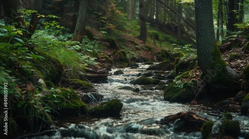 Naklejka premium Small river flowing through a green forest in the summer with mossy rocks and...