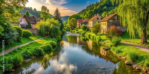 Fototapeta premium Small river flowing through a picturesque village surrounded by lush greenery , landscape, calm, landscape, calm, serene