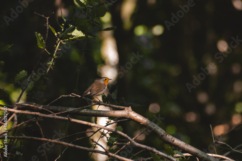 © Joe, Fototapeta premium Small Robin sitting on a branch in a sun beam
