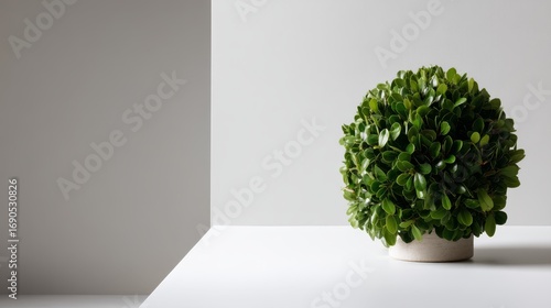 © Elena, Fototapeta premium Small round green shrub with dense foliage in a white pot, neatly trimmed, placed on a white surface against a minimal white background, emphasizing freshness, symmetry, and natural beauty