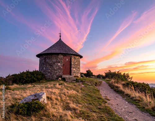 Fototapeta premium Small Round Hut on Hilltop with Pastel Sky