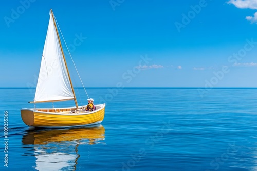 © Punprapa, Fototapeta premium Small sailboat with white sails on the ocean, with one person in the boat