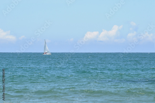 © ajcsm, Obraz premium Small sailing boat with crew sailing in the middle of the ocean