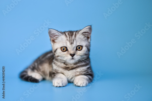 © Александрина Демидко, Obraz premium small Scottish Fold kitten on a blue background