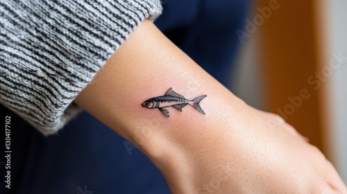 © Julia Jones, Obraz premium Small shark tattoo on forearm of caucasian adult female wearing knit sweater