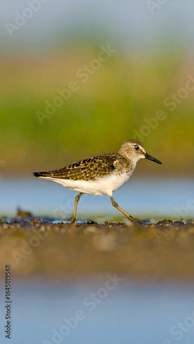 © Su, Obraz premium Small shorebird walks along muddy bank, shallow water in background