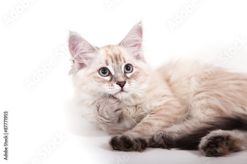 © D'Action Images, Obraz premium Small Siberian Neva Masquerade kitten on blue purple background. Cat sitting.