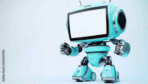 Fototapeta premium Small-sized robot presenting a blank screen from the right side, ideal for...
