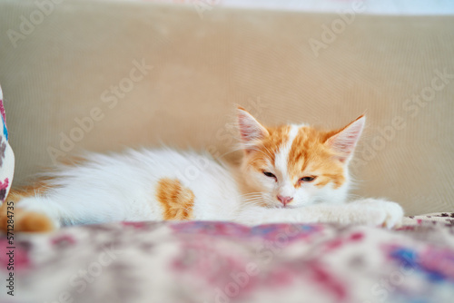© luengo_ua, Obraz premium Small sleepy kitten on a pillow.