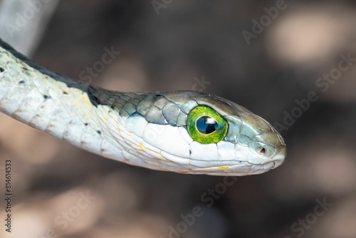 © Wirestock, Obraz premium Small snake's head and beady green eyes, looking straight at the camera