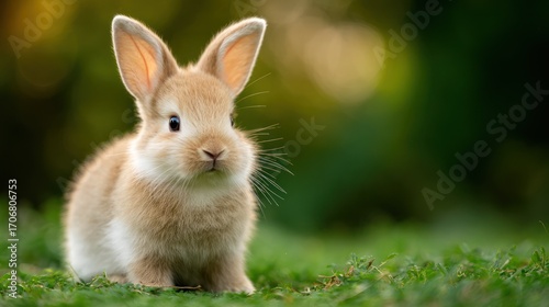 © cha, Fototapeta premium Small, soft, peach-colored bunny sits on green grass with blurred green background