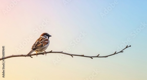 © Mitul, Fototapeta premium Small Sparrow on Bare Branch. Minimal Nature Concept.