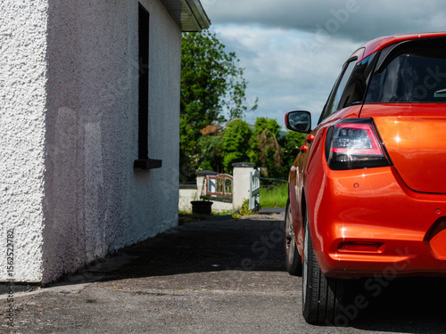 © mark_gusev, Fototapeta premium Small sport red car parked by a house with white walls, rural area in the background. Warm sunny day. Living in a country side concept. Commute and transportation theme.
