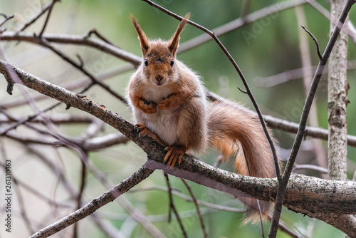 Fototapeta premium Small squirrel sits on the tree in the forest.