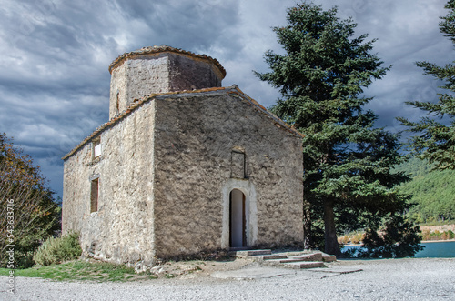 © Stratos Giannikos, Fototapeta premium Small stone chapel of St. Fanourios on lake Doxal in Ancient Feneos of Corinth. Greece