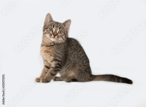© Hanna Darzy, Obraz premium Small striped kitten sitting on gray