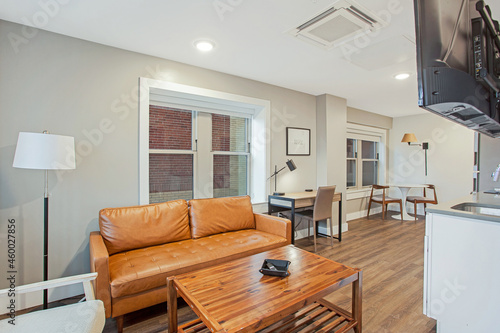 © samiam2007, Fototapeta premium Small studio apartment in city with hardwood floors and open floor plan