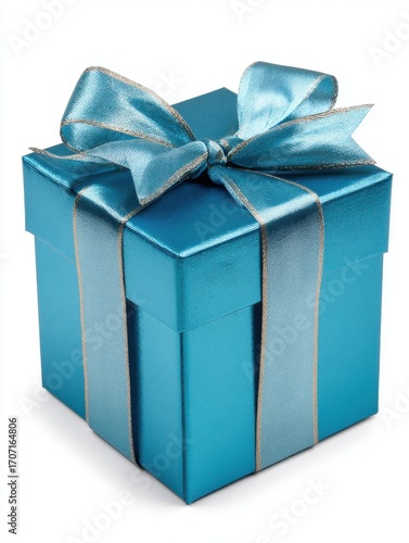 © Yothin, Obraz premium Small Teal Gift Box with Silver Ribbon Bow on White